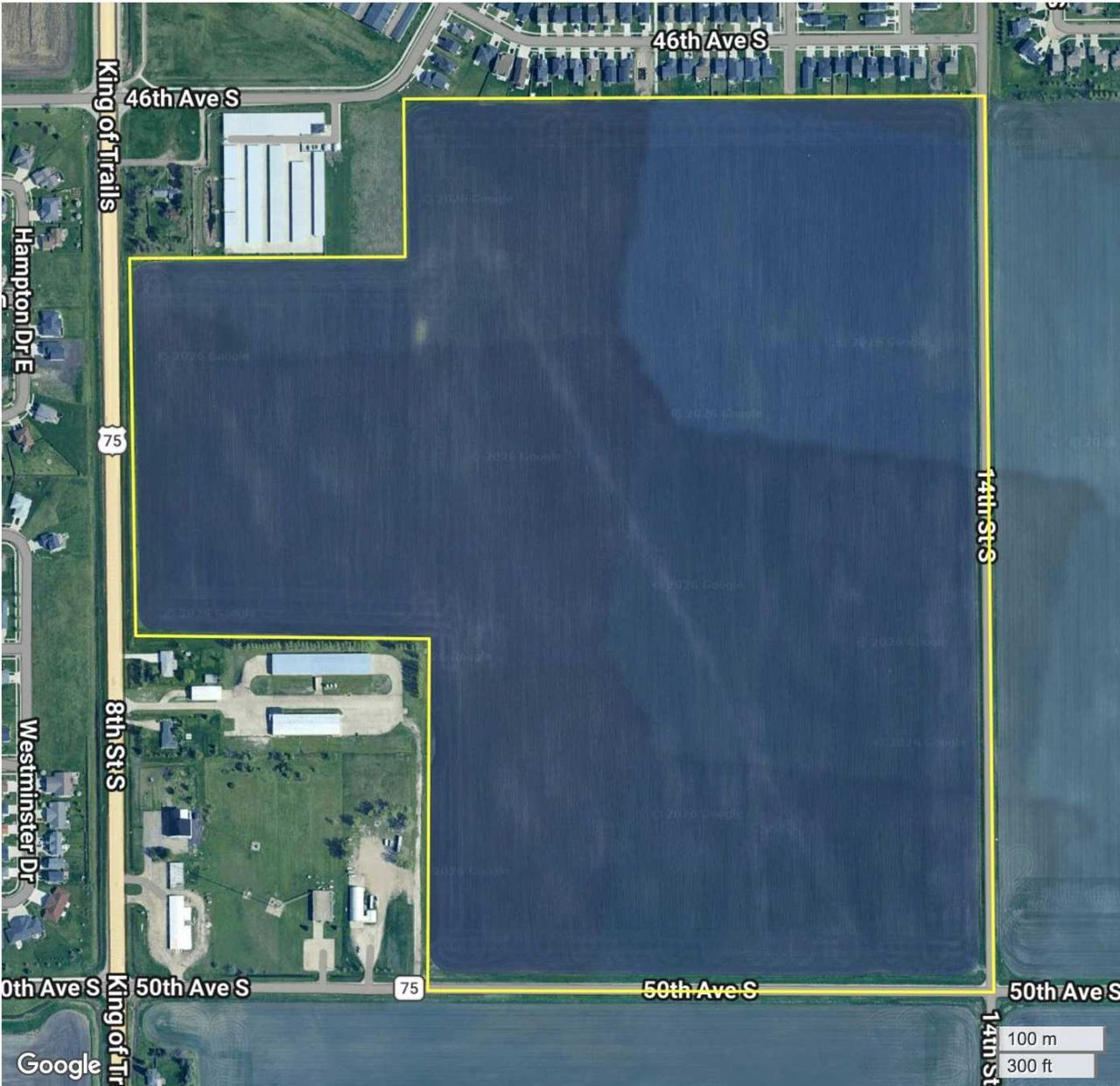 127± Acres | Prime Development Land | South MoorheadExcellent opportunity to acquire 127± acres of development land just outside Moorhead city limits. Ideally located along the city's expanding south side, with frontage on Highway 75 and directly adjacent to established residential neighborhoods near 46th Ave S and 50th Ave S.This predominantly flat, tillable parcel offers strong potential for future residential or mixed-use development. Surrounded by ongoing growth, the property sits in a high-demand area with nearby access to utilities, making it well-positioned for annexation and phased development.Rare chance to secure a large, contiguous tract in the path of Moorhead's continued expansion.